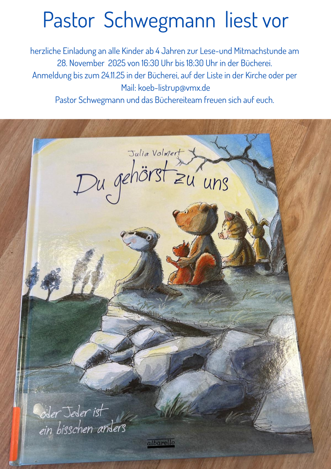 Herzliche Einladung an alle 4-7jährigen Kinder zur Lese- und Mitmachstunde am 27.09.24 von 16:30 Uhr bis ca. 18:00 Uhr mit Pastor Schwegmann, in der Bücherei.