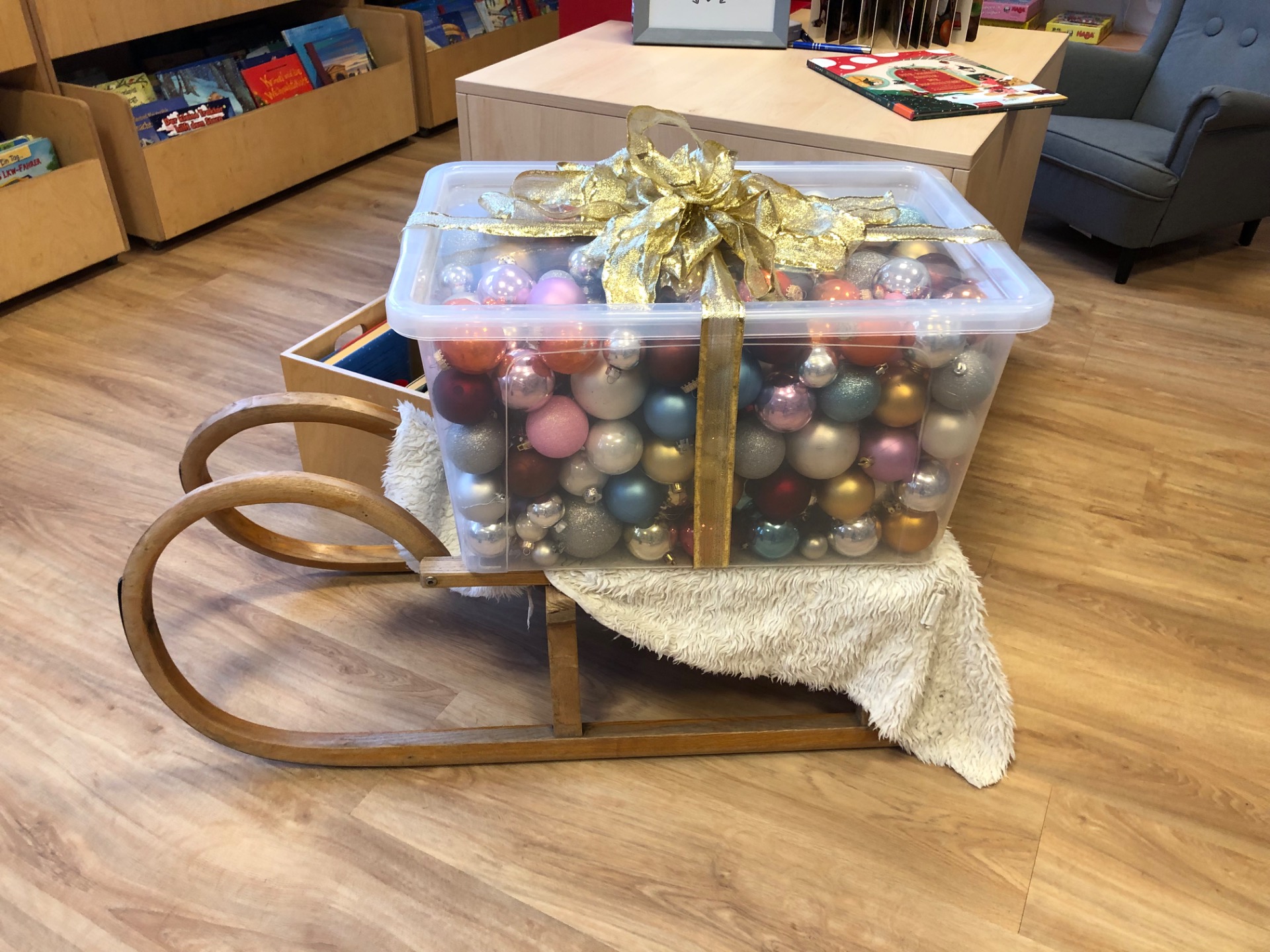 In diesem Jahr galt es, die Anzahl der Weihnachtskugeln in einer Kiste zu erraten. Viele Kinder haben uns und den Wichtel in der Bücherei besucht und eifrig mitgeraten. Zu gewinnen gab es Gutscheine der Drogerie Rossmann im Wert von 15,00 €, 10,00 € und 5,00 €.